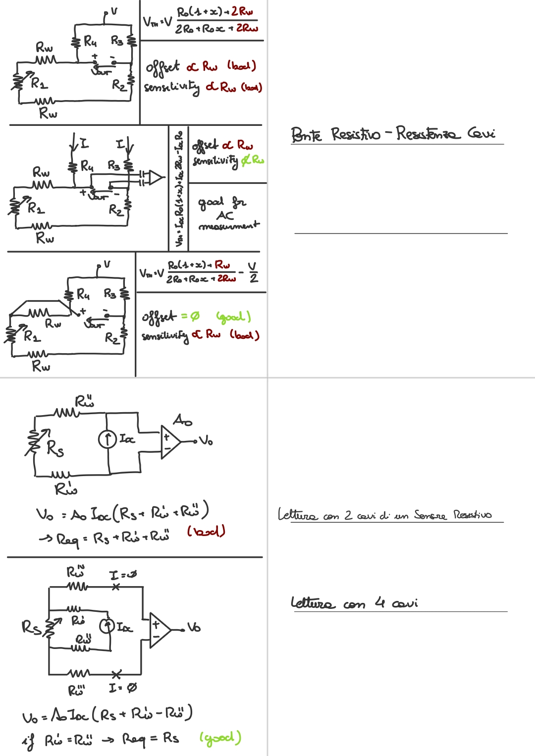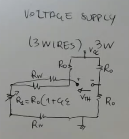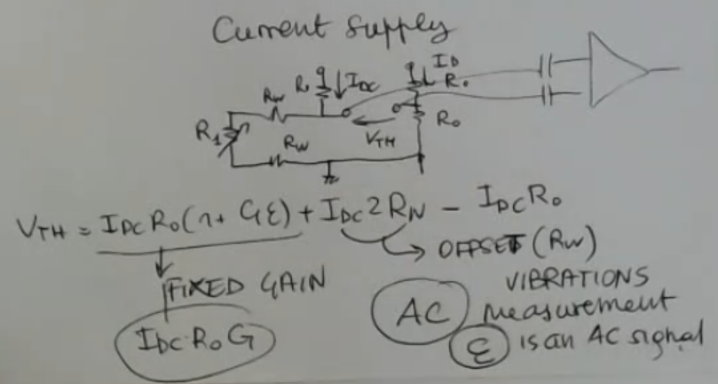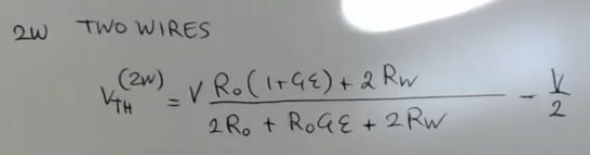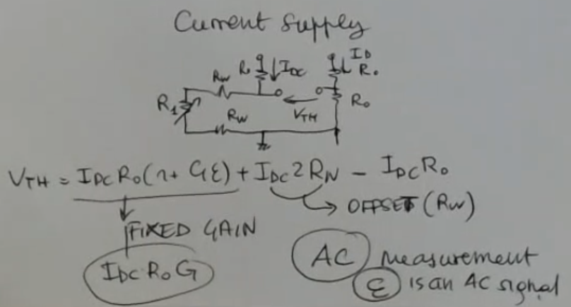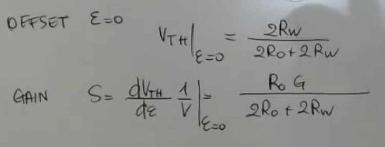 The output formula will become:So we have an offset equal and sensitivity equal to:NOT_SURE_ABOUT_THIS (redo the sensitivity calculations)The offset in theory could be corrected. However the sensitivity is different from the nominal one. And both offset and sensitivity depend on the wire resisitance, so both value can change, a variable offset and a variable gain, are errors that I cannot correct.