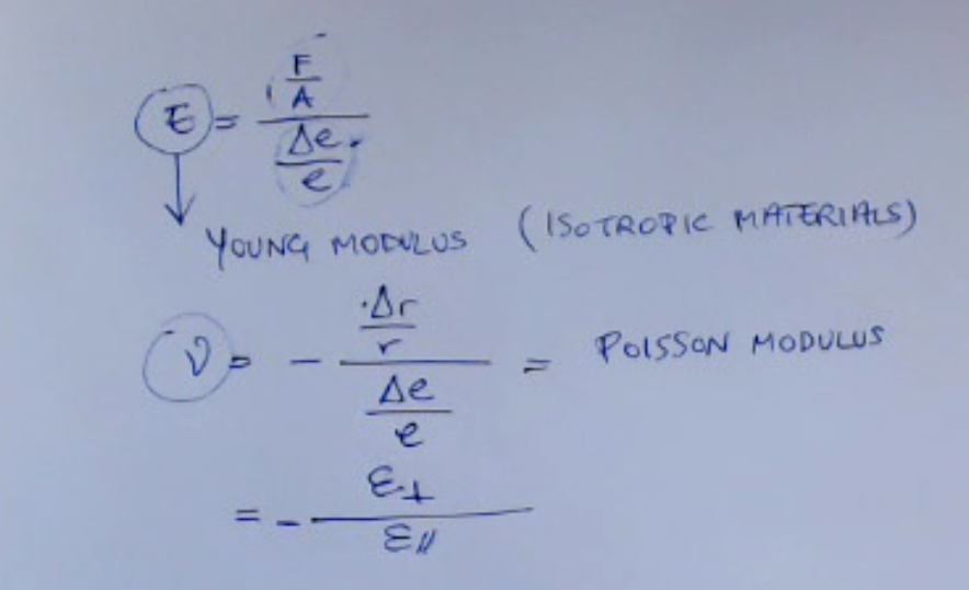 ==For isotropic materials, the Young modulus is independent on the direction of application of the force==. - Then I also define the “Poisson module”, which represents the ratio between the perpendicular strain (with respect to the applied force) and the parallel strain.
