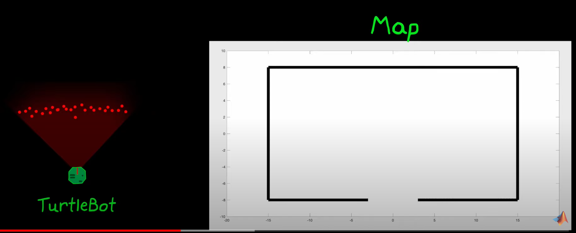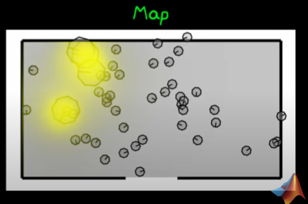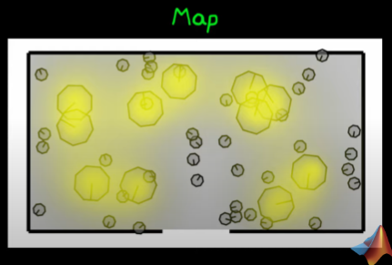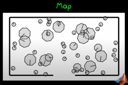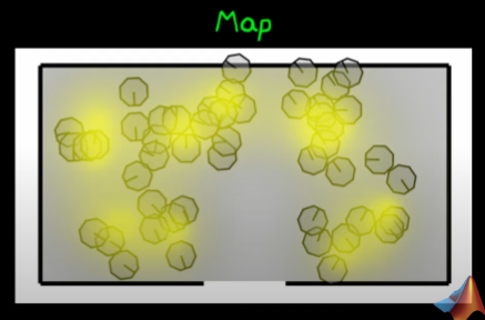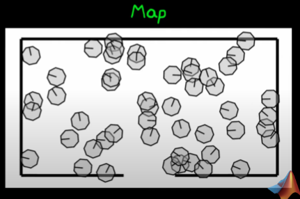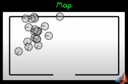 - The robot could be anywhere on the map, to do this I take a finite set of randomly taken bot (random position, random orientation) and put the in a simulated map:
