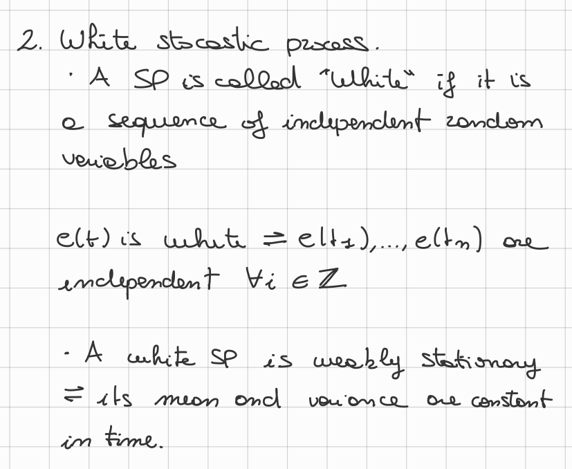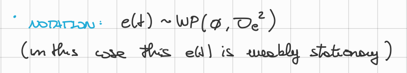 e(t) \sim \operatorname{WP}(0, \sigma_e^2) $$ We can say that:\begin{array}{l} m_e = 0 \ R_e(\tau) = \left{\begin{array}{l} R(0) = \sigma_e^2 &\tau =0 \ 0 & \tau \neq 0 \end{array}\right. \end{array}