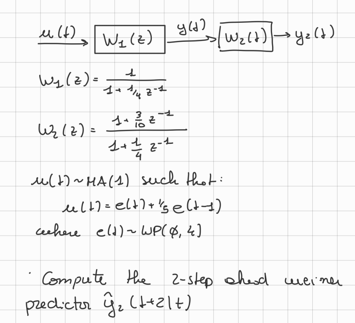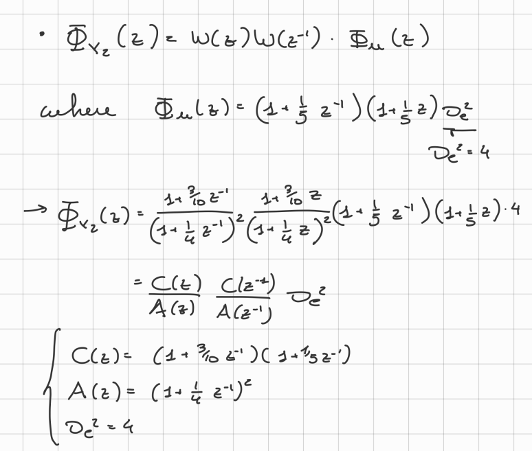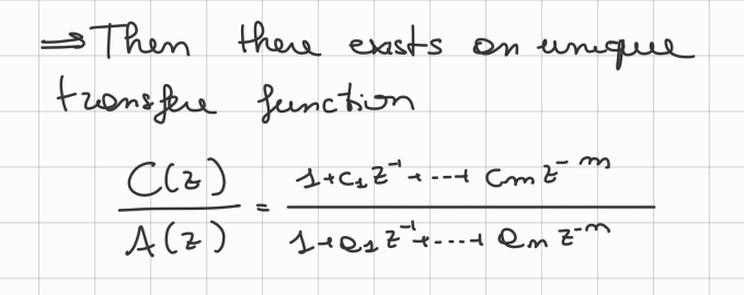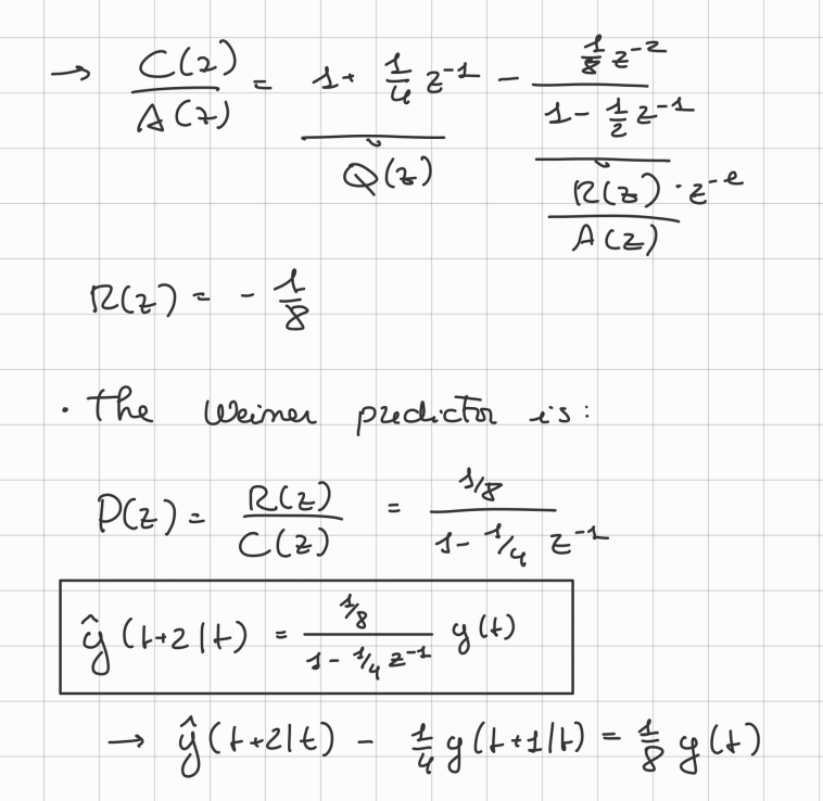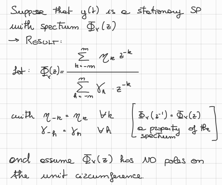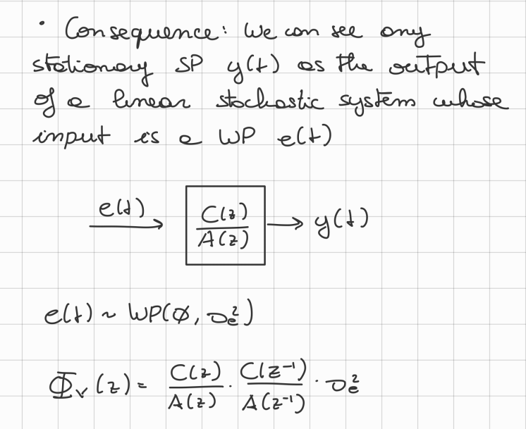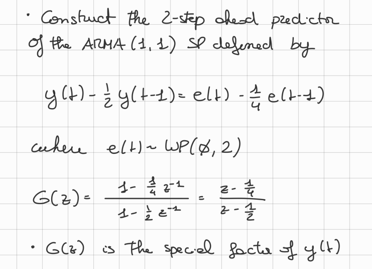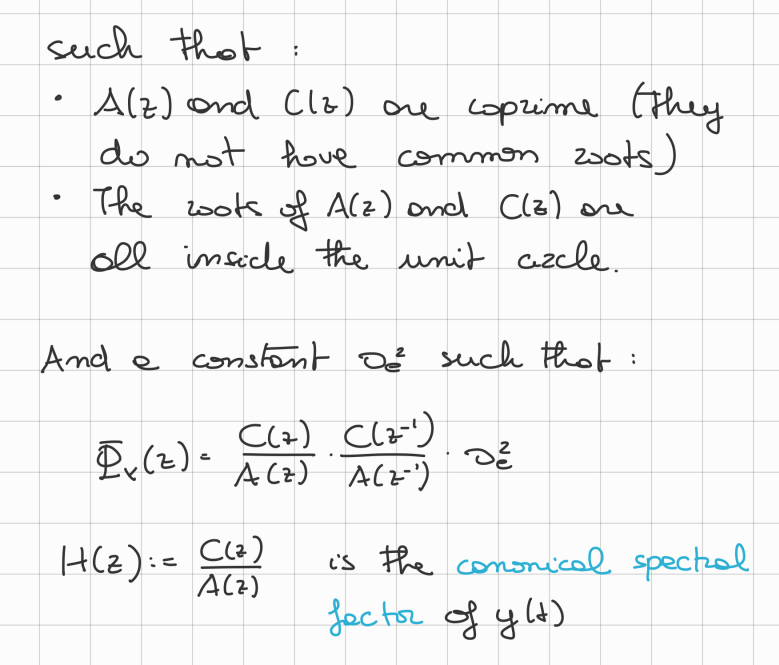 Professor Notes notes_timeseries.pdf homework_timeseries.pdf Time Series Prediction Spectral Factorization (We can substitute e(t)=C(z)A(z)⋅y(t) because the roots of C(z) are inside the unit circle) Prediction Error ~Ex.: ~Ex.: