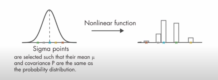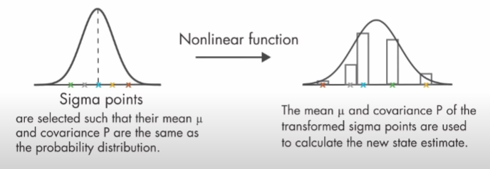 - Calculate the approximate Gaussian distribution of the state estimate using the non-linear function of the system and the sigma points, this approximation will replace the covariance matrix.